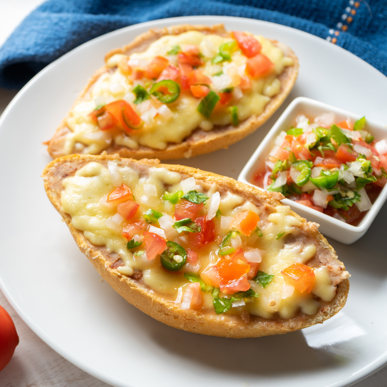 Molletes con Guiso pan gratinado con queso y vegetales